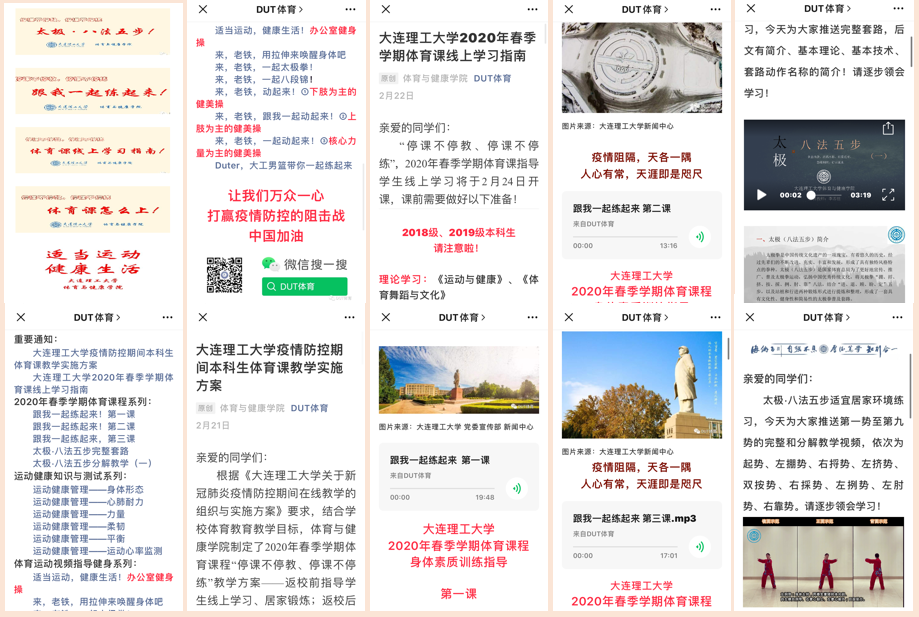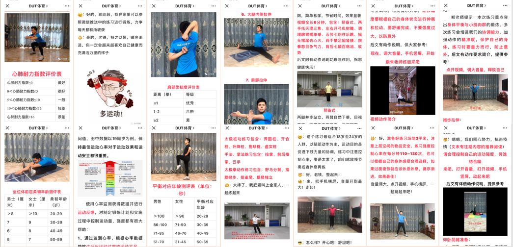 防疫网络工作小组,以指导师生合理锻炼、提高免疫力为目标,以缓解师生居家的心理压力为重点,先后制作了利于师生健康的体育运动健身指导和健康专业知识相关视频,通过“DUT体育”微信公众号推送专题23篇。