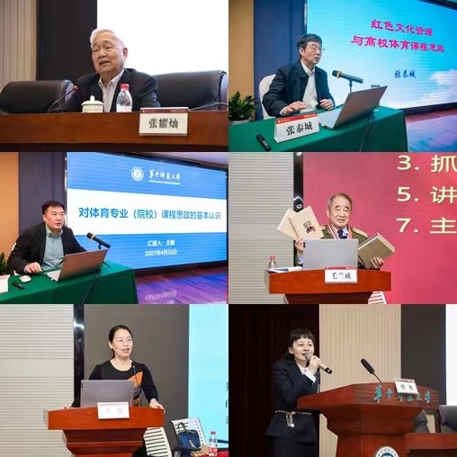 教授黄莉分别做了题为《思想政治教育学科的特点和研究方法》、《红色文化的思想政治教育价值及实现路径》、《红色文化资源与高校体育课程思政》、《对体育专业课程思政的基本认识》、《传承红色基因,矢志铸魂育人》、《在继承与创新中发扬光大中华体育精神》的主题报告。