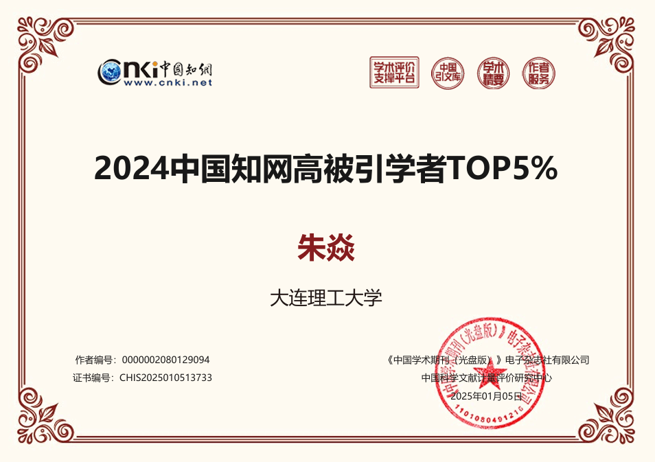 朱焱副教授入选2024中国知网高被引学者TOP5% ,8篇文章入选2024年中国知网高被引用论文学术精要,其中双高论文3篇,高PCSI论文、高被引论文2篇,高被引论文、高下载论文1篇。