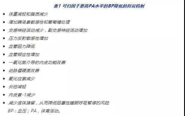 PA被定义为通过骨骼肌的收缩产生的身体运动,其将能量消耗增加到高于静息水平。锻炼是中度至剧烈强度的PA,具有计划性、结构化和重复性,旨在改善或维持健康。久坐行为,其特征是在坐姿或卧姿下能量消耗≤1.5代谢当量(metabolic equivalents), 被认为是一种与中度或重度PA所用时间不同的构造,因为两者均与全因死亡率独立相关。表1显示了可能成为较高PA水平对BP和心脏代谢风险的益处基础的拟议机制。