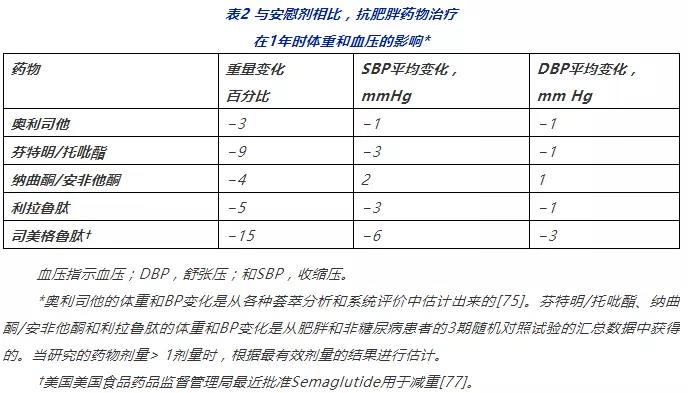 表2 与安慰剂相比,抗肥胖药物治疗在1年时体重和血压的影响*